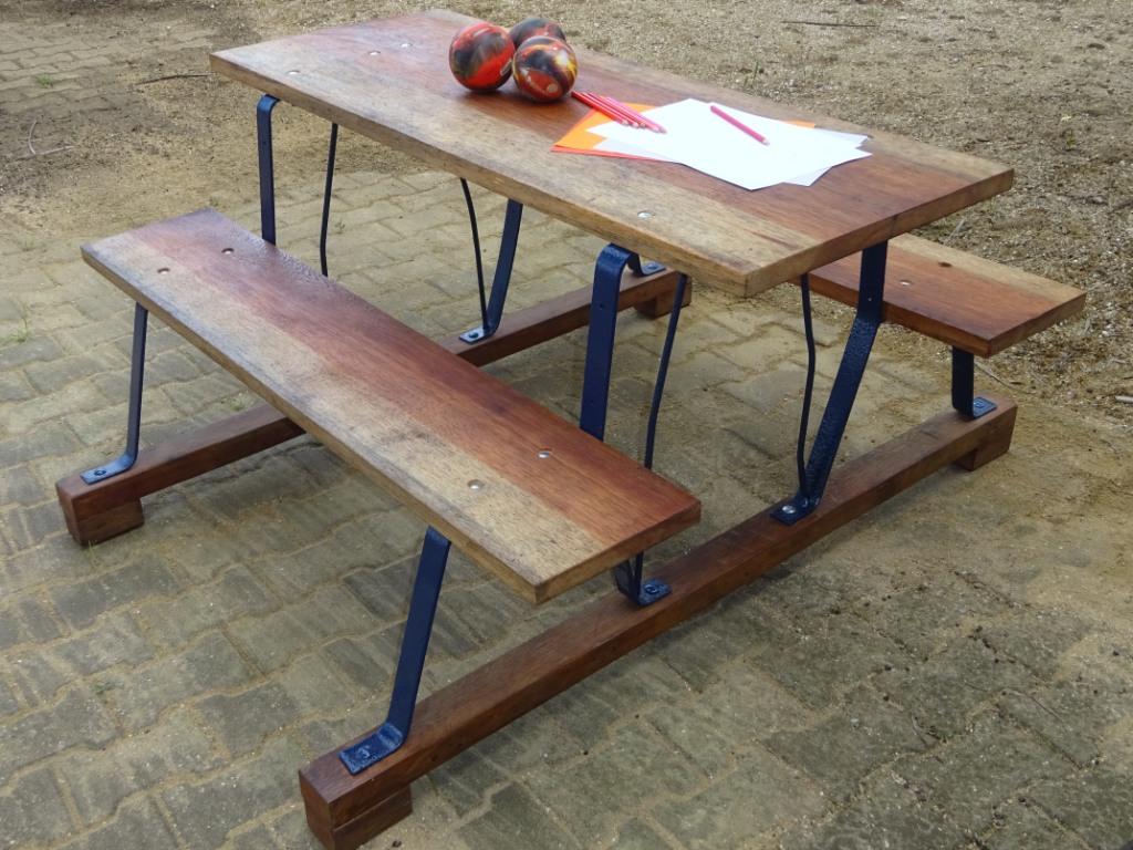 Houten picknicktafel voor kinderen, voorzien van metalen onderstel. Dit onderstel is gerecycled van oude schoolbanken, dus expres ruw gelaten met een speciale afwerking. Leuk voor in de tuin of terras.