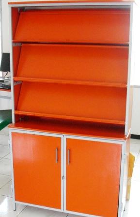 L-vormige Dressoirkast met onder en boven afsluitbare kasten en een showplank. Afmeting 180cm x 100cm bij 30/40 cm. Te gebruiken in de klas, de keuken of op kantoor. Klik op de foto voor een totaalbeeld.